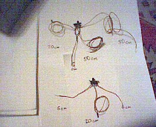 Az előkészítés menete: a 7-es, és 14-es lábak kivételével a többit jobbra-balra széthajtogatjuk (kiterítjük). A 4-es, és 11-es lábakat az IC tetején át teljesen visszahajtjuk és egymással összeforrasztjuk. A 12-es, és 13-as lábakra kb. 6 cm-es vezetékeket forrasztunk, az 5-ös, és 6-os lábakra pedig kb. 20 cm-es vezetékeket. Az 5,6 lábak teljesen egyformák logikailag, ezért az általam használt vezeték (PC floppy szalagkábel két vezetéke) csak a végein van kettéválasztva, és különösebben nincs erenként megkülönböztetve. (Az IC több kaput tartalmaz, mint amire szükség van, más jó bekötés is lehetséges, de ha a gyári kapcsolást építjük utána, akkor nem kell katalógusokkal vacakolni, ezért lett pont így. A TTL IC-k bemenete gyárilag magas logikai szintre áll be, ezért nem szükséges a nem használt bemeneteket sehova sem kötni. Tulajdonképpen a nem használt IC lábak akár tőből le is vághatók. A 7-es és 14-es kell, azok maradjanak!)