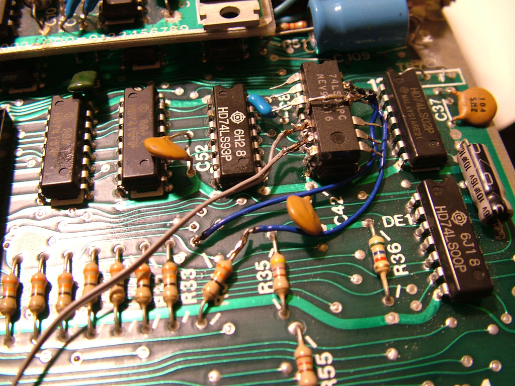 A DA7-es adatvonalat fóliavágás nélkül, az R34-es ellenállásnak a 74157-es IC-re csatlakozó lábának, a panelból való kiforrasztásával tudjuk megbontani. Az extra IC-nk 12-es lábáról jövő vezetéket a panelba a kiforrasztott ellenállásláb helyére kell bekötni. A 13-as IC-lábról jövő vezetéket pedig a kiforrasztott ellenálláslábhoz, a levegőben kell hozzákötni, és zsugorcsővel szigetelni ezt a forrasztást. Az extra IC 5-ös 6-os lábáról jövő két vezetéket a G10-es IC-nek az 1-es, és 3-as lábára kell bekötnünk, a sorrend lényegtelen. (Gyárilag nincs előkészítve, közvetlenül az IC-lábakhoz kell forrasztani.)